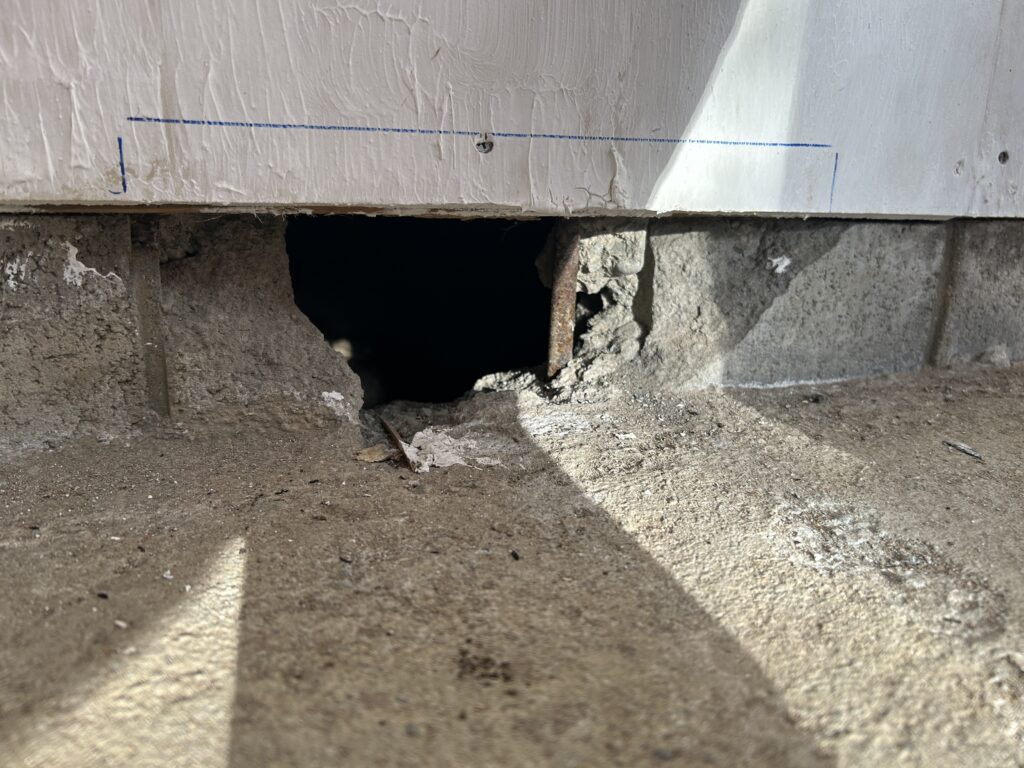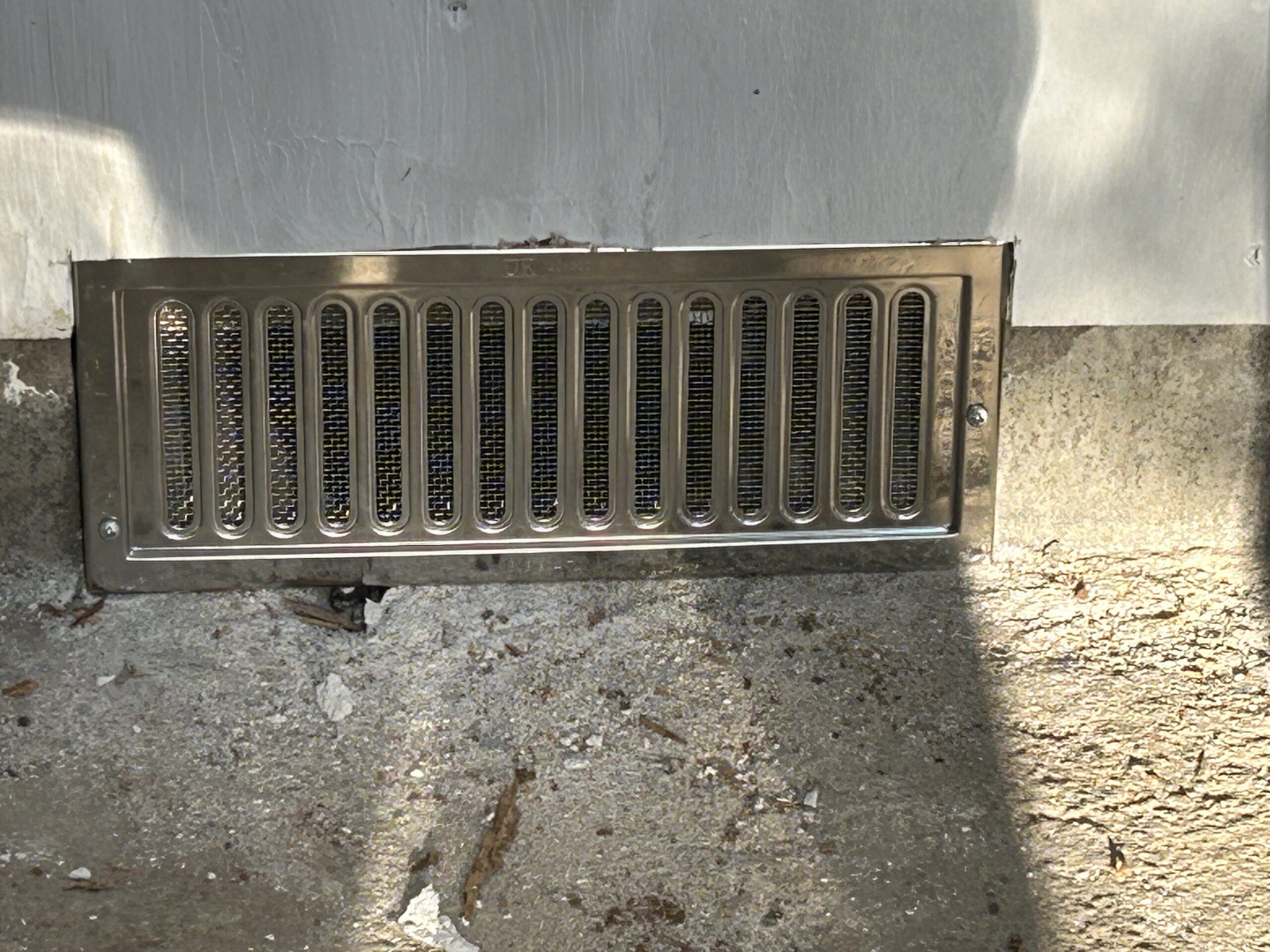 訪れた5号物件は、やっぱり少し寂しげに見えた。6号物件が「手のかからない優等生」なら、5号は「ちょっと心配な次男坊」みたいな存在だ。今日はその5号に、基礎換気口のカバーを取り付ける作業をする。もともとここは居室をガレージに変えた場所で、基礎の通気口自体はあったのだが、壁を解体した関係で“むき出し状態”になっていた。つまり、通気はできているけれど、このままでは床下に虫や小動物が侵入し放題。通気性は良好でも、防御力ゼロというわけだ。