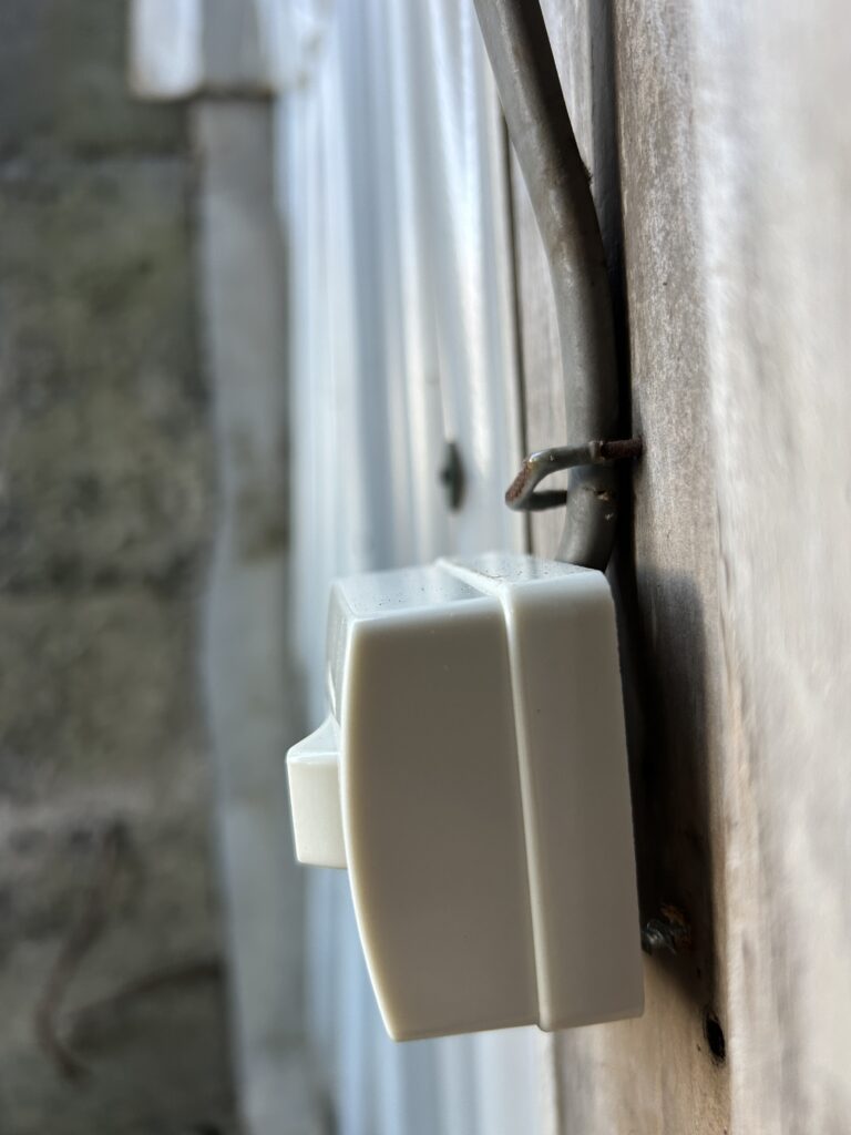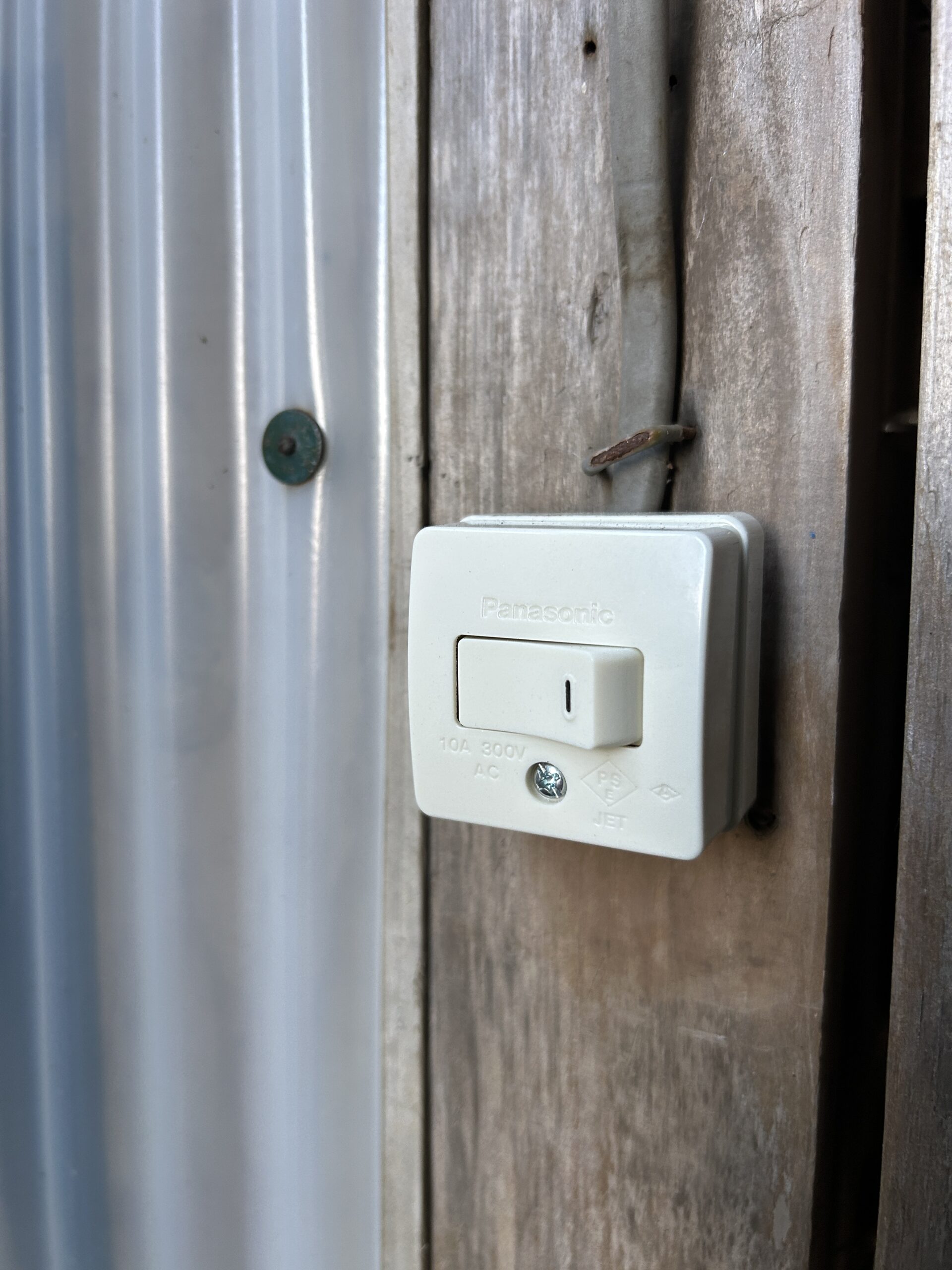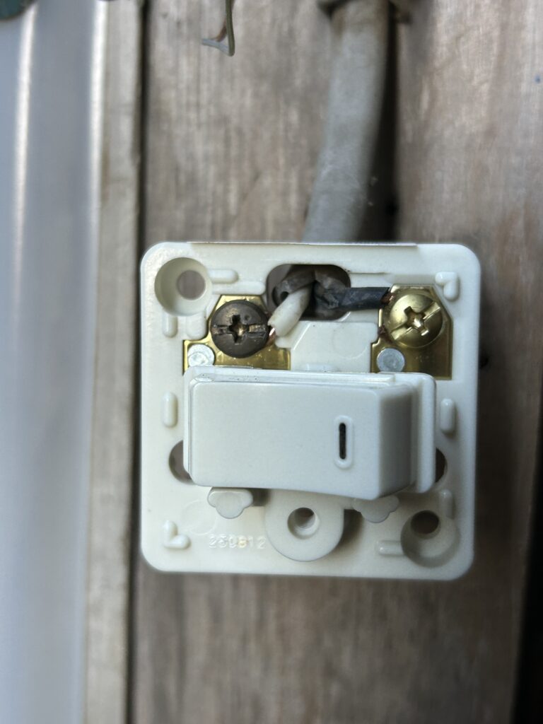 屋外といっても軒下で雨がかからないので、「取り付けビスが錆びてきたし、同タイプのスイッチに丸ごと交換でいけるだろ」と軽いノリで開始。
