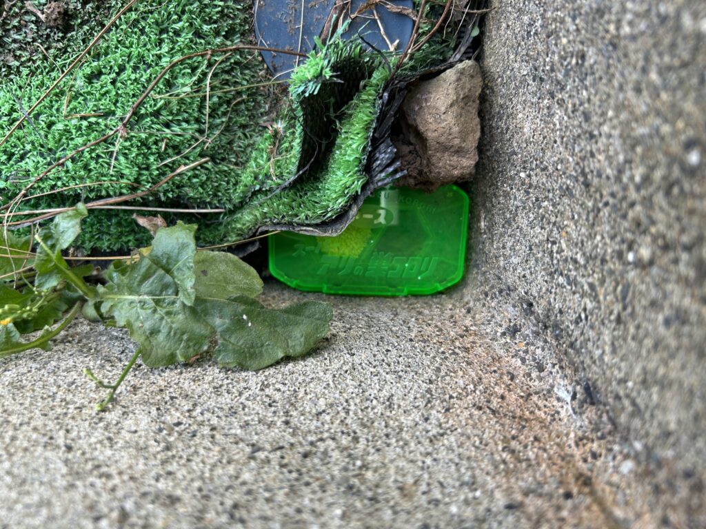 玄関横、勝手口近く、庭の隅、そして水道付近。設置中もアリたちは容赦なく働き続ける。巣から巣へ、延々と運搬作業。見ているとウッとなるほどの量。いや、これほんとに全員集合してない?