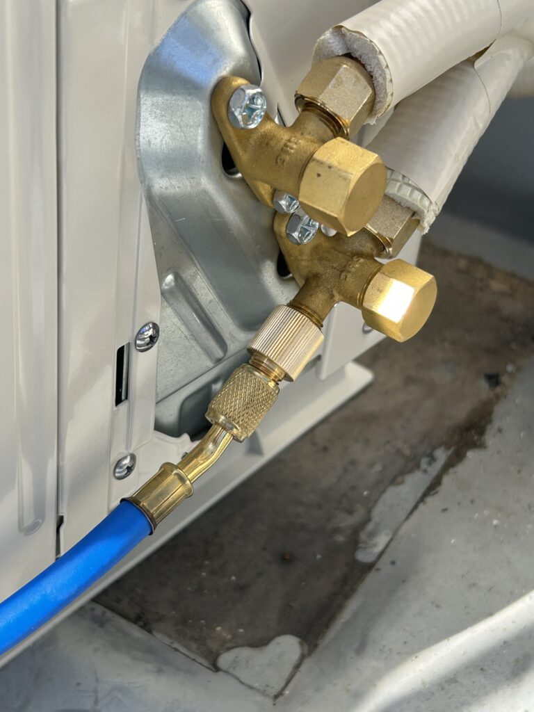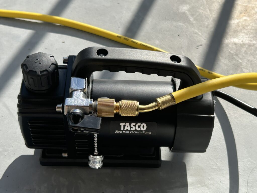 さあ、真空引きだ。頼りのTASCOポンプを登場させ、マニホールドゲージを接続……あれ?入らない。