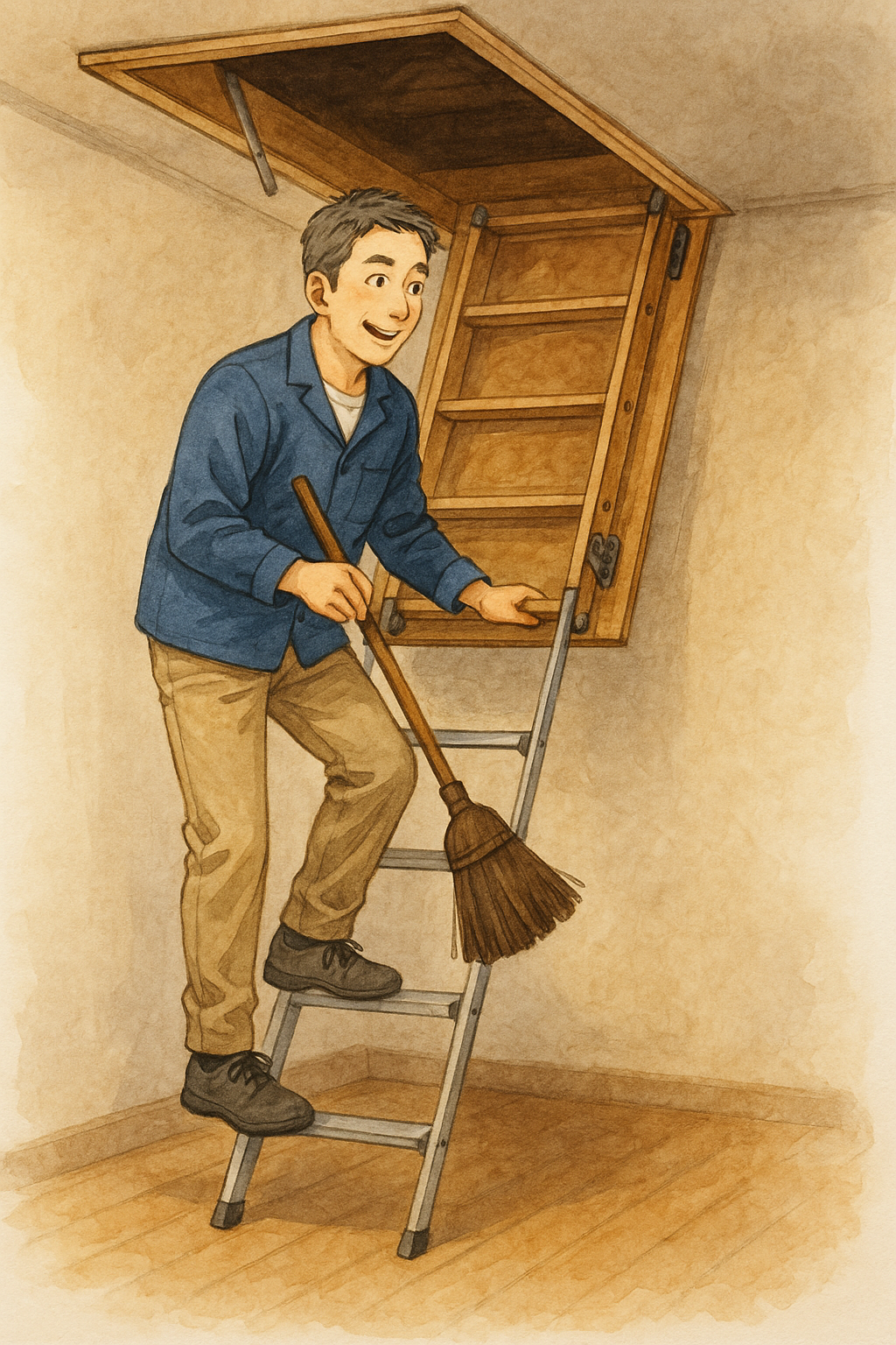 この屋根裏、はしごではなく収納式の折り畳み階段つき。